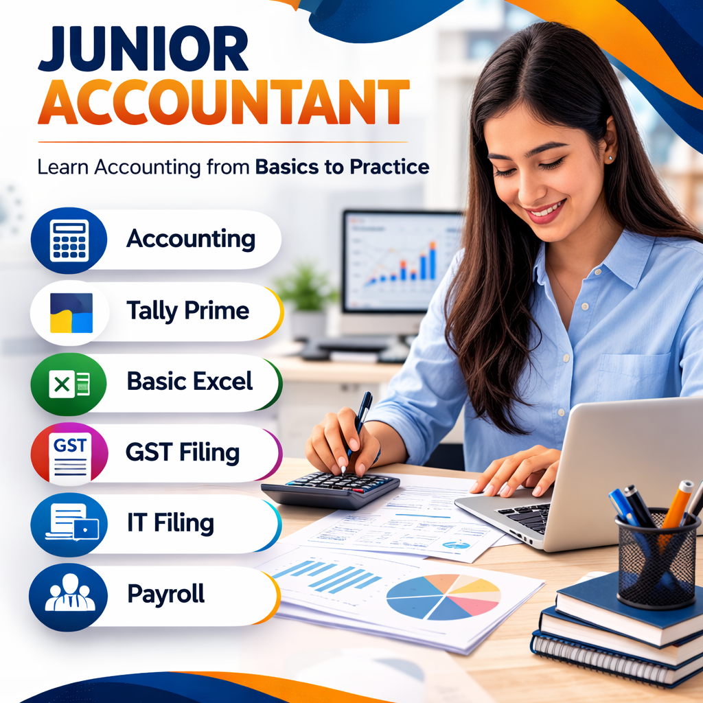 The Junior Accountant Course is designed for beginners who want to build a strong foundation in accounting and taxation. This course focuses on practical, job-oriented skills that help you start your career in accounts with confidence.